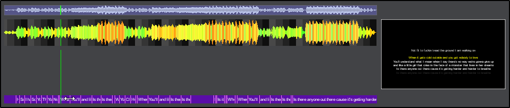 Once all the lyrics are populated (automatically, manually, or a combination of both) you can adjust the timing of the lyrics so that they synchronize with the file properly. The lyrics will be represented on the timeline in purple and each line will be defined by a pink marker. Grab the pink marker and drag it to the desired position to adjust the timing. All lyrics located to the left of the marker will maintain their position while all lyrics to the right will follow the marker in order to preserve their timing. The time stamps in the editor will automatically change while editing the lyrics position on the timeline.