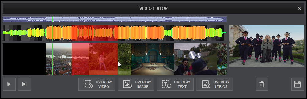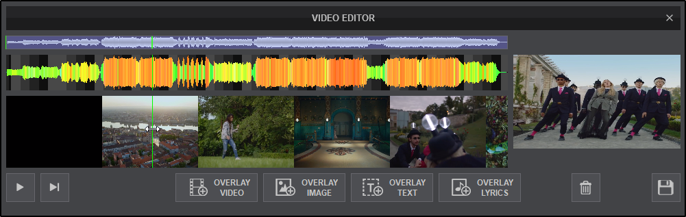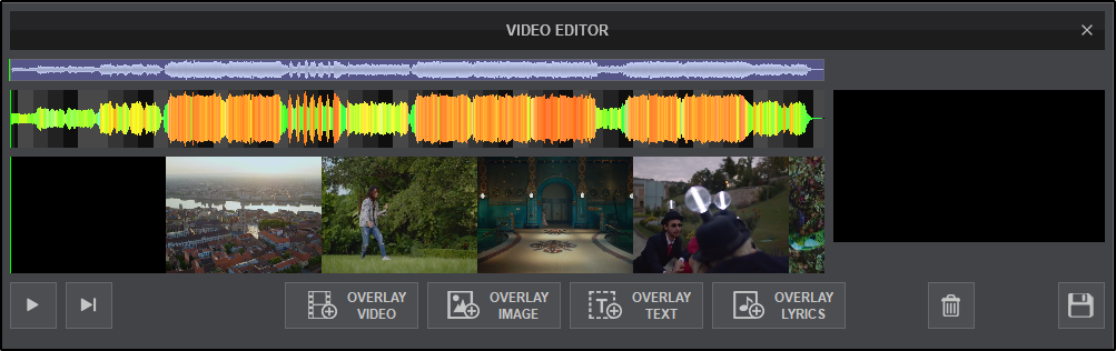 Used to create and insert Lyric Overlay(s)* into the Video Timeline based on a timestamp. - VIDEO PREVIEW. Displays the video elements and overlays of the file being edited based on the position of the Playhead. Using Play-Stop or Play-Hold will preview the edits made in real time. If the video is not playing, the frame that the video is stopped on will be displayed (if available).