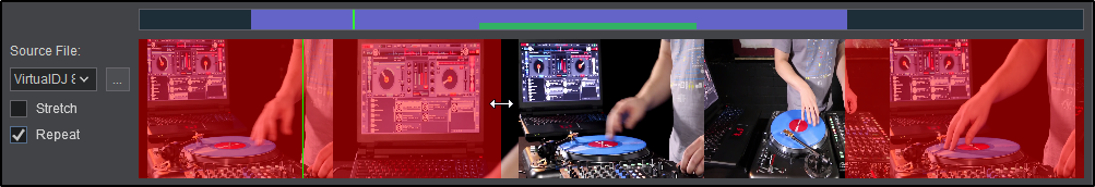 In the Overlay Editor, highlight the section of the clip to be used in the Video Timeline by grabbing the ends of the clip and dragging them to resize and reposition the portion of the clip to be used. Click on Stretch and/or Repeat if the selected area is larger than the video clip being used as the overlay.