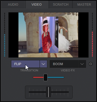 When a video gets loaded to a deck, the Video Mixer interface changes to a Dual-Source Mixing view which will change the Video Source menu to a Transitions menu.