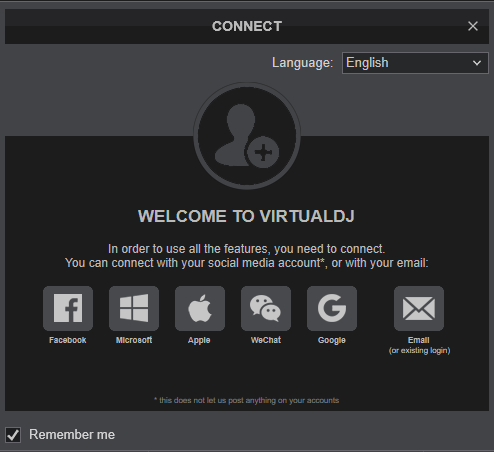 b) Login/Create an Account: You can Login with your existing account or create one if you don't have a VirtualDJ ID. For more information on how to create an account, please see the Create an Account page.