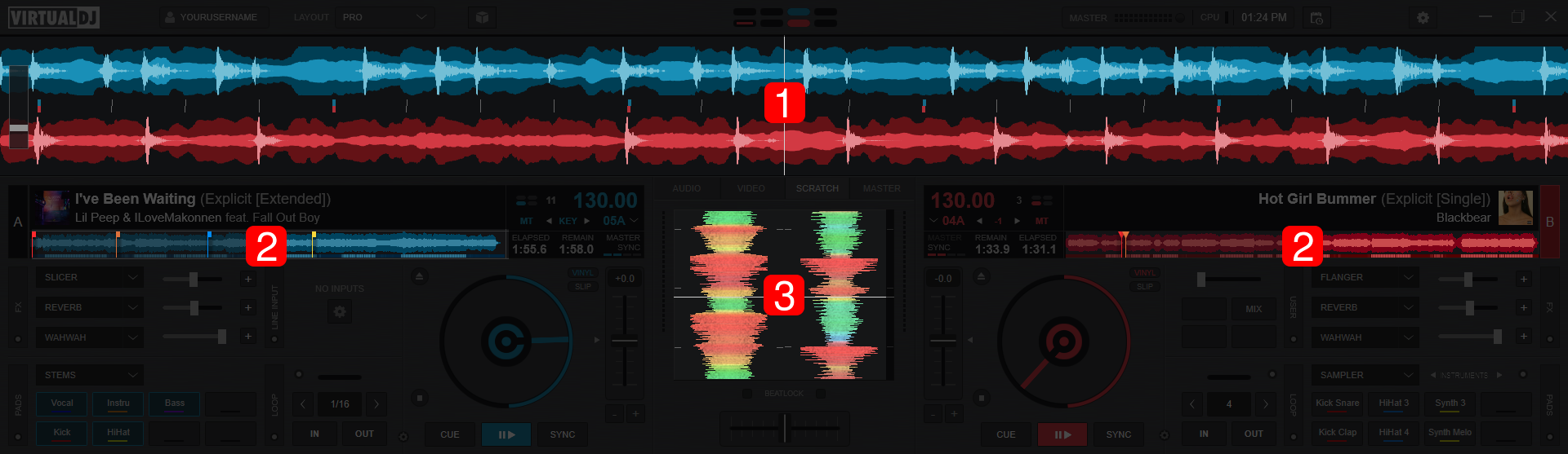 A waveform is a visual representation of an audio signals frequency and amplitude. There are 3 locations on VirtualDJ’s Main Interface where waveforms are displayed in order to provide valuable visual feedback to assist with mixing and/or scratching.