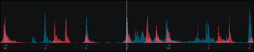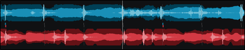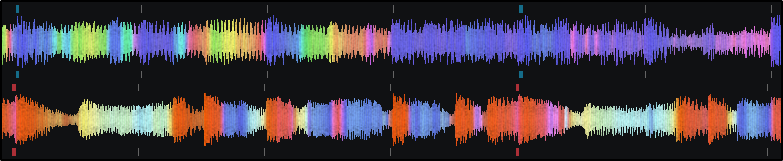 - RHYTHM WAVEFORM. Displays the peaks and curves of the track on multiple decks as well as the Computerized Beat Grid (represented by dashes at the bottom of the wave) to better visualize the tracks relationships with one another and make beat matching easier. How the waveform is displayed can be changed by clicking on the Waveform Display selector in the Layout Menu (Essentials, Pro, and Performance Layouts). If Shapes is the selected Waveform, portions of the waveform will be grayed out when using Stem Isolation features in order to visually display which frequencies are amplified or muted.